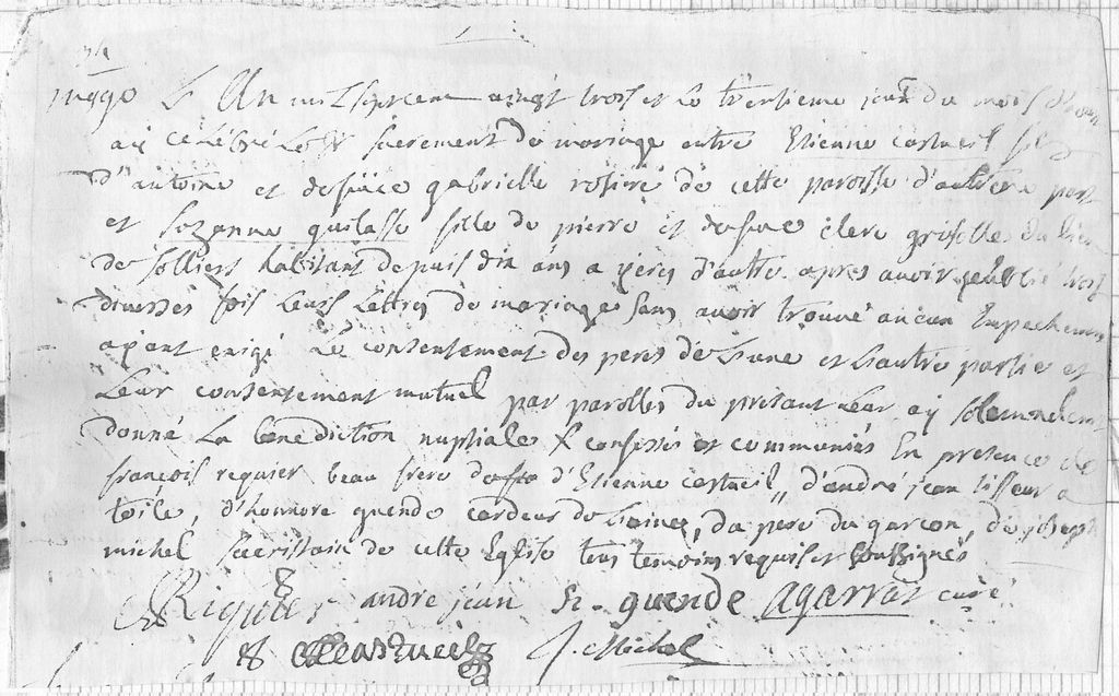 L'an mil sept cent vingt trois et le trentième jour du mois d'aoust, ay célébré le St Sacrement de mariage entre Étienne CASTUEIL, fils d'Antoine et de feüe Gabrielle ROSIÈRE, de cette paroisse d'une part, et Suzanne GUÉLASSE, fille de Pierre etde feue Clère GRISOLLE, du lieu de Solliès, habitant depuis dix ans à Yières d'autre, après avoir publié trois [un mot illisible] fois leurs lettres de mariage sans avoir trouvé aucun empêchement, ayant exigé le consentement des pères de l'uneet l'autre partie et leur consentement mutuel par parolles du présant, leur ay solemnelement donné la bénédiction nuptiale et confessé et communiés en présence de François REQUIER, beau frère d'Étienne CASTUEIL, d'André JEAN, tisseur à toile,d'Honnoré GUENDE, cordeur de laine, du père du garçon, de Joseph MICHEL, Sacristain de cette Église, tous témoins requis et soussignés,