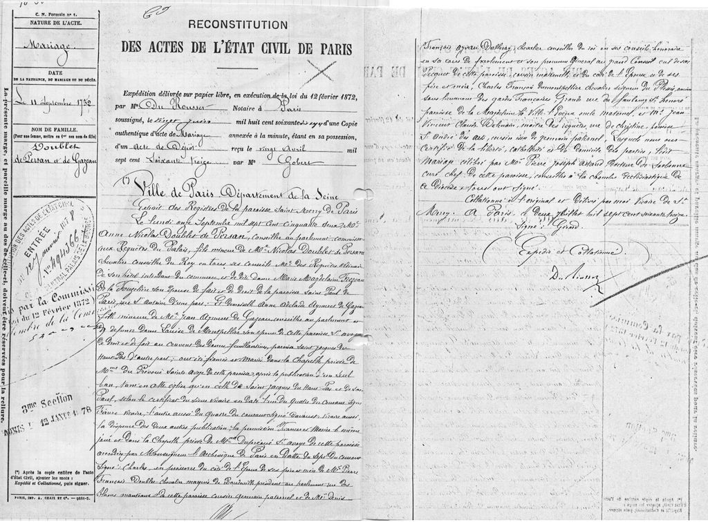 Note : D'après le partage des biens de Nicolas DOUBLET de PERSAN, père de l'époux, le 18 février 1758 devant Plastrier Not., Paris. | | Mariage | 11 septembre 1752