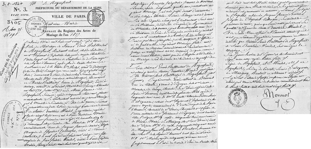 Extrait du Registre des Actes de Mariage de l'an 1827. Du trois mai mil huit cent vingt sept à midi, Acte de Mariage de Aimar Louis Balthazar de ROQUEFEUIL, lieutenant colonel, chef de bataillon au 1er Régiment d'Infanterie de la garde royale,Chevalier de l'ordre royal et militaire de Saint Louis et de l'ordre royal de la légion d'honneur, âgé de plus de trente huit ans et huit mois, né à la trève St Michel, arrond. de Guingamp (Côtes du Nord) le vingt deux août mil sept cent quatrevingt huit, demeurant à Paris de droit chez sa mère, rue du Cherche Miidi, n°15, onzième arrondissement, fils majeur de Charles Balthazar, Baron de ROQUEFEUIL, décédé à Auray, arrond. de Lorient (Morbihan) le onze thermidor an trois (21 juillet1795) et de Marie Jeanne de ROQUEFEUIL, sa veuve, âgée de cinquante huit ans, présente et consentante. Le contractant autorisé au présent mariage par le Ministre Secrétaire d'État à la Guerre, suivant la permission en date à Paris du vingtquatre avril dernier. Et de Anne Ernestine WENDEL, propriétaire, âgée de plus de vingt huit ans, née à Paris, troisième mairie, le vingt deux frimaire an sept (12 décembre 1798), y demeurant chez sa mère, rue Barbette n°8, huitièmearrondissement, veuve de Jacques François Xavier Joseph, Marquis de CLAPIER-COLLONGUE, décédé à Vienne (Autriche), le neuf février mil huit cent vingt deux, fille majeure de Jean Frédéric WENDEL, décédé à Paris, septième mairie, le onze août milhuit cent quatorze, et de Angélique Françoise Joséphine Jeanne de WAVRANS, sa veuve, âgée de cinquante quatre ans, consentante au présent mariage, par acte passé devant DEMANCHE et son collègue, Notaires à Paris, le douze avril dernier. Lesactes déposés soit par le contractant sont ceux de sa naissance, de décès de son père et la permission du Ministre de la Guerre ; par la contractante ceux de sa naissance, de décès de s on père et de son précédent époux et le consentement de samère ; les dits actes par ? et par nous paraphés, et les certificats d'affiche e t de publication du présent mariage faite aux huitième et onzième arrondissement les dimanches quinze et vingt deux avril dernier, desquels nous avons donnélecture, ainsi que du chapitre six du titre du mariage sur les droits et les devoirs respectifs des époux. Ledit Aimar Louis Balthazar de ROQUEFEUIL a déclaré prendre Anne Ernestine WENDEL pour épouse, elle Aimar Louis Balthazar de ROQUEFEUILpour époux ; En présence de Louis Albert de BRANCAS, dux de CÉRESTE, grand d'Espagne de la 1ère classe, Maréchal de Camp, Chevalier de St Louis, Officier de la légion d'honneur, demeurant rue de la Planche, n°86, âgé de cinquante ans, ami ; deMr le comte Octavien Pierre Louis d'ALVYMARE, colonel du 1er Régiment d'Infanterie de la garde royale, commandant de l'ordre royal de la légion d'honneur, Chevalier de St Louis, Chevalier de 1ère classe de l'ordre militaire de St Ferdinandd'Espagne , dem euran t rue de la Ville l'Évêque, n°39, âgé de cinquante trois ans, ami ; de Nicolas Marie de MARIGNY, Chev ali er de St Louis, demeurant rue St Lazare, n°76 bis, âgé de cinquante cinq ans, ami ; De Marquis Jean Baptiste BonBOUTARD, homme de lettre, Chevalier de la légion d'honneur, demeurant rue de Seine, n°8, 10ème mairie, âgé de cinquante six ans, ami. Conformément à l'avis du Conseil d'État du trente mars mil huit cent huit, il a été déclaré par l'épouse et lestémoins que dans l'acte de décès de son premier époux, ce dernier est prénommé et nommé par erreur Joseph de CLAPIERS, au lieu de Jacques François Xavier Joseph de CLAPIERS-COLLONGUE, ses véritables prénoms et nom, qu'on y a omis aussi parerreur sa qualité d'époux de Anne Ernestine WENDEL. Et de suite, nous, officier de l'État Civil, attendu qu'il n'est pas survenu d'opposition, avons prononcé au nom de la loi que Aimar Louis Balthazar de ROQUEFEUIL et Anne Ernestine WENDEL sontunis par le mariage. Les époux, la mère de l'époux et les témoins ont signé avec nous après lecture faite.