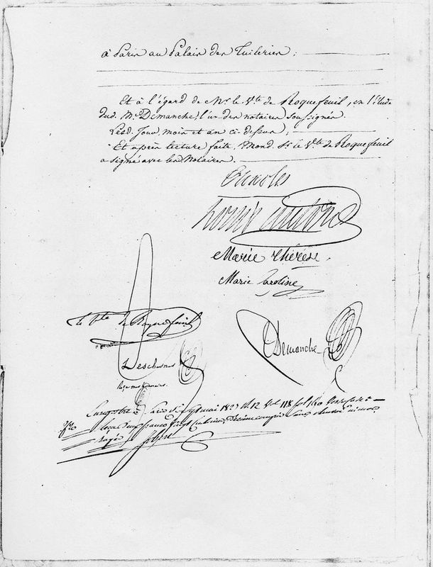 (Ont signé : Charles, Louis ?, Marie Thérèse, Marie Caroline, le Vte de Roquefeuil, Deschesnes, Demanche).