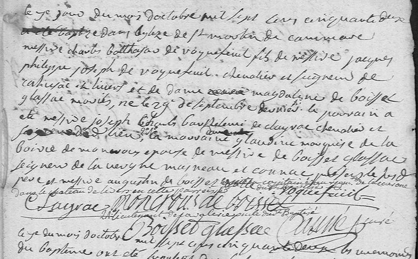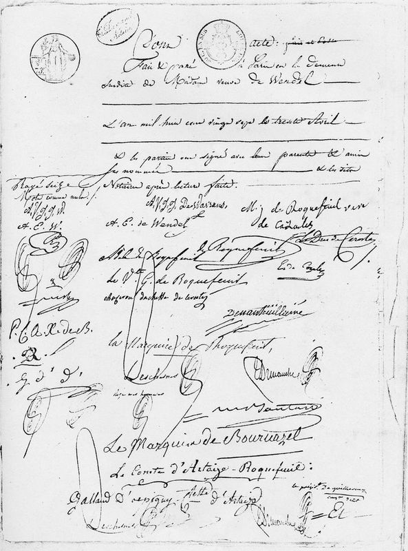 Par devant Me François Alexandre Théodore DEMANCHE, et Me FROGER DESCHESNES, notaires à Paris soussignés, furent présents : M. Émar Louis Balthézar, Vicomte de ROQUEFEUIL, Chef de Bataillon au premier régiment de la Garde Royale, Chevalier desordres Royaux de St Louis et de la légion d'honneur, demeurant à Paris, rue du Cherche Midi, n°15 ; Fils majeur de feu Charles Balthazar, Vicomte de ROQUEFEUIL, Capitaine de Vaisseau, Chevalier des Ordres de St Louis et de Malthe, et de DameMarie Jeanne de ROQUEFEUIL, son épouse, veuve en seconde noces de Mr Jacques Anne Marie de CAZALÈS, membre de l'assemblée constituante ; Stipulant et contractant pour lui et en son nom, d'une part ; Mademoiselle Anne Ernestine de WENDEL, veuvesans enfans de Mr Jacques François Xavier Joseph, Marquis de CLAPIER COLLONGUE, Chevalier de St Louis, colonel au service d'Autriche, demeurant à Paris, rue Barbette, n°8 ; Fille majeure de Dame Angélique Françoise Joséphine Jeanne de WAVRANS,et de Monsieur Jean Frédéric de WENDEL, décédé, stipulant et contractant pour elle et en son nom, d'autre part ; Et ladite Dame Angélique Françoise Joséphine Jeanne de WAVRANS, veuve de mondit Sr Jean Frédéric de WENDEL, propriétaire, demeurantà Paris, susdite rue Barbette, n°8 ; Stipulant tant à cause de la dot qu'elle va ci après constituer à la dite Dame sa fille, qu'à cause des diverses stipulations dont les présentes feront l'objet, encore d'autre part. Lesquels Sr Vicomte deROQUEFEUIL et Dame veuve Marquise de CLAPIER COLLONGUE, dans la vue du mariage qu'ils sont dans l'intention de contracter ensemble et dont la prononciation doit avec incessamment lieu en la mairie d'un des arrondissements de Paris dans l'étendueduquel l'un d'eux demeure, en ont arrêté les clauses et conditions civiles de la ma nière et ainsi qu'il suit. En présence et de l'agrément de madite dame veuve de CAZALÈS, mère du futur époux & encore en présence de : Mademoiselle AdélaïdeGabrielle Magdeleine de ROQUEFEUIL, sœur du futur ; de Monsieur Edmond Louis Marie de CAZALÈS, frère utérin du futur ; & de Monsieur Gustave, Vicomte de ROQUEFEUIL, cousin germain du futur ; De Mr Louis Albert de BRANCAS, Duc de CÉRESTE, Grandd'Espagne de 1ère classe, maréchal des camps et armées du Roi, Chevalier de St Louis et officier de la légion d'honneur ; de Mme Pauline Henriette de MONESTAY CHAZERON, duchesse de CÉRESTE ; de Mr Alexandre Pierre Charles César, Comte d'ARTAIZEROQUEFEUIL, Chevalier de St Louis et de la légion d'honneur et des ordres de Malte et de Portugal ; de Mme la Comtesse d'ARTAIZE ROQUEFEUIL ; de Mr Jean François César, Baron de GUILLERMY, commandant de la légion d'honneur, Conseiller d'État etPrésident de la Cour des Comptes ; de Mr de NANTEUIL aîné ; de la Marquise de ROQUEFEUIL ; et du Marquis de BOURNAZEL.