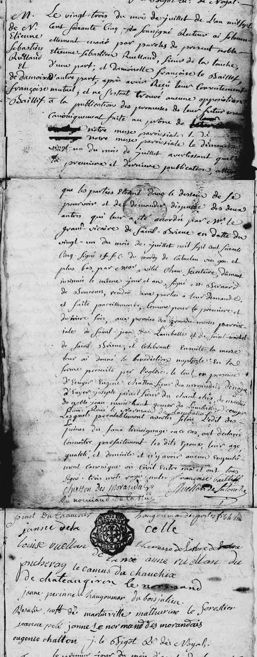 Publication : État-civil en ligne des Archives départementales des Côtes-d'Armor. Détails de la citation : État-civil de Noyal – BMS-1748-1792, image 104. | | Mariage | 23 juillet 1765