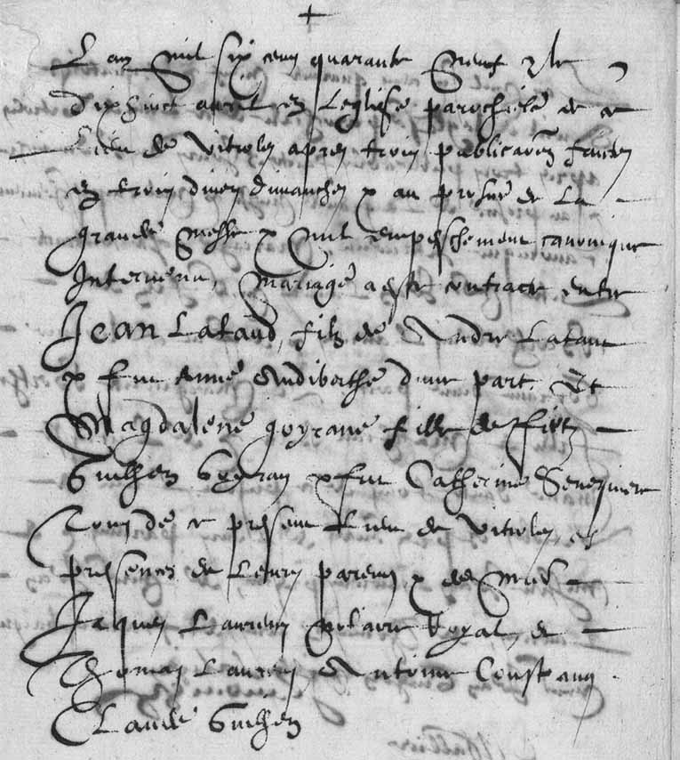 L'an mil six cens quarante neuf & le dix huict avril, en l'église parochiale de ce lieu de Vitroles, après trois publica[ti]ons faictes en trois divers dimanches & au prosne de la grande messe & nul empeschement canonique intervenu, mariage a esté contracté entre Jean LATAUD, fils de André LATAUD & feu Anne AUDIBERTE, d'une part, et Magdalène GOYRANE, fille [de] Guilhen GOYRAN & fut Catherine ROUQUIÈRE, tous de ce présent lieu de Vitroles, en présence de Henry PARIM & de Mr Jaques LAURENS, notaire royal, & Thomas LAURENS, Antoine CONSTANT, Claude GUILHEN.