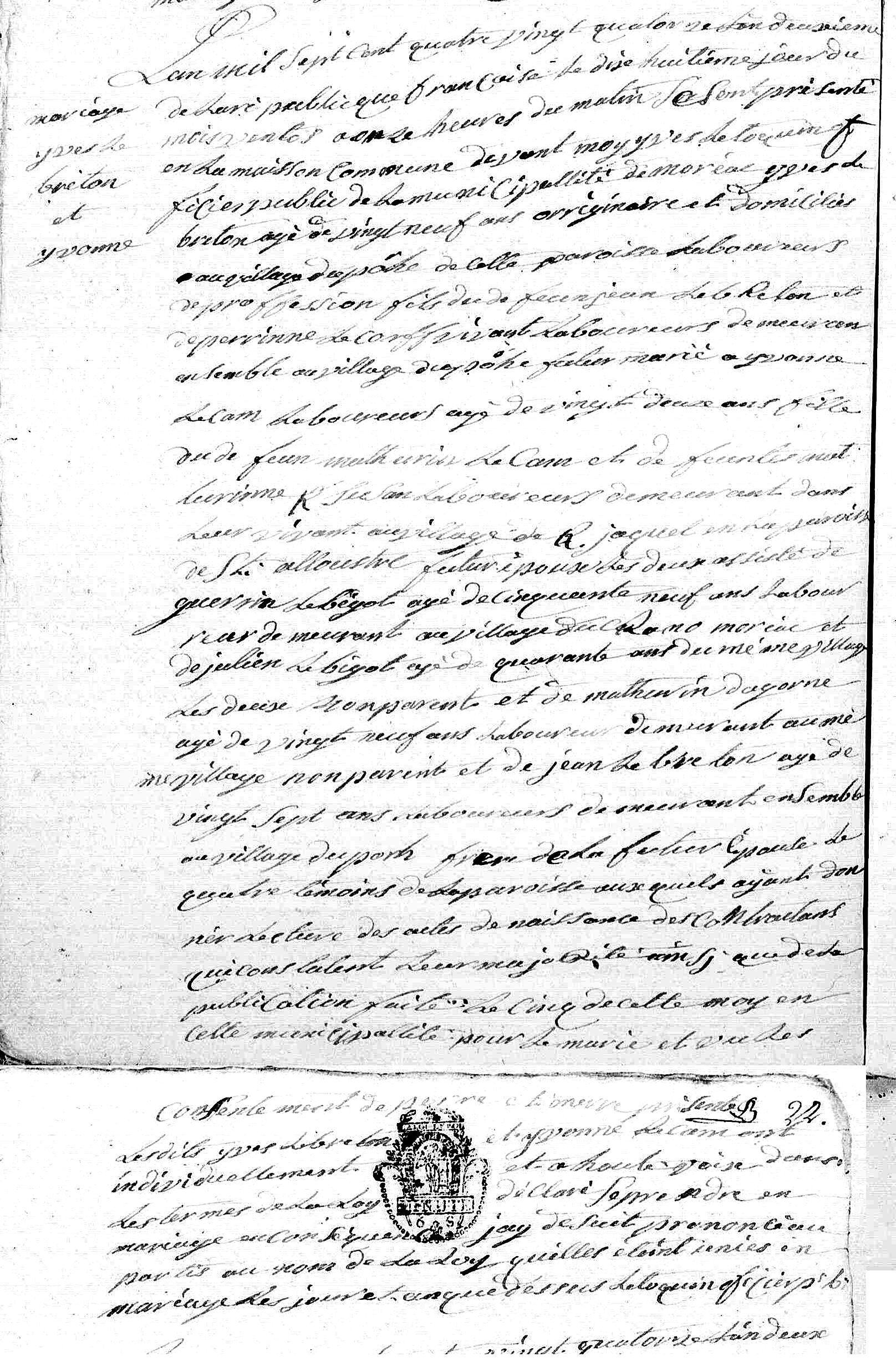 L'an de grace mil sept cent quatre vingt quatorze le deuxième de la république française le dix huitième jour du mois ventos [08/03/1794] a onze heures du matin se sont présenté en la maison commune devant moy Yves Le Toquin officier public de la municipalité de Moréac Yves Le Breton âgé de vingt neuf ans originaire et domicilié au village de [...] de cette paroisse laboureur de profession fils de feu Jean Le Breton et de Perrinne Le Cerf [ou Le Conff] vivante laboureur demeurans ensemble au village de Kerpoke futur marié a Yvonne Le Cam laboureur agé de vingt deux ans fille du de feu[...] Mathurin Le Cam et de feu[...] Mathurine K[er]susan laboureurs demeurant dans leur vivant au village de K[er] Jaquel en la paroisse de St. Allouestre futur épouse les deux assisté de Jocellin Lebégot agé de cinquante neuf ans laboureur demeurant au village de […] Moréac et de Julien Lebégot agé de quarante ans du même village les deux non parent et de Mathurin Dagorne agé de vingt neuf ans laboureur demeurant au même village non parent et de Jean Le Breton agé de vingt sept ans laboureur demeurant ensemble au village Kerpoke frère de la futur époux les quatre témoins de la paroisse auxquels ayant donnér lecture des actes de naissance des contractans...Lesdits Yves Le Breton et Yvonne Le Cam ont individuellement et à haute voix dans les termes de la loy déclaré vouloir se prendre en mariage en conséquance j'ay de suite prononcé au partis au nom de la Loy quilles étaint unies en mariage les jours et an que dessus.