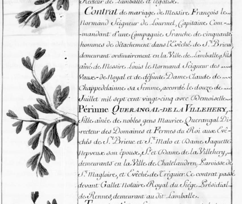 Publication : Preuves de noblesse pour les Écoles royales militaires (y compris La Flèche) – 1753-1790, 40 volumes (le volume 17 manque). – dressées par Antoine Marie d'Hozier de Sérigny.. Détails de la citation : Vol. 19, page 177. Note : passé devant Maître Gallet, notaire royal. | | Mariage | 12 août 1725