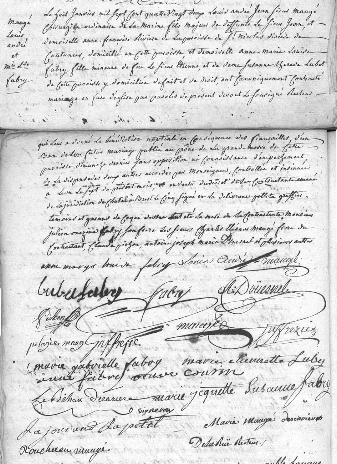 Publication : Documents divers provenant des Archives départementales du Finistère (Brest). Détails de la citation : B 2519. Note : Archives départementales du Finistère (Brest), cote B 2519 : Décret de mariage de Anne Marie Louise FABRY, fille de Étienne et de Suzanne LUBET, et de Louis André MAUGÉ, Chirurgien ordinaire de la Marine, du 2 janvier 1782. | | Mariage | 8 janvier 1782