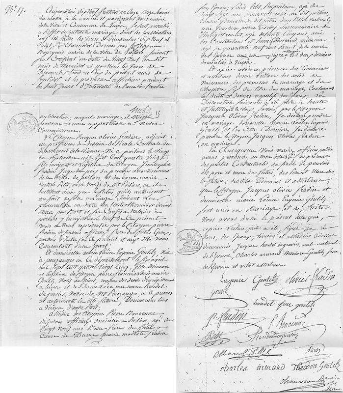Aujourd'hui dix neuf fructidor, an Onze, onze heures du matin, à la mairie et par devant nous Maire de la ville et commune de Luçon, se sont présentés à l'effet de contracter mariage dont les publications ont été faites les jours de dimanchesdix neuf et vingt six Thermidor dernier par le citoyen BOURGEOIS, maire de la ville de Poitiers, suivant son certificat en date du vingt neuf dudit mois de thermidor et par nous les jours de dimanches trois et dix du présent mois de fructidor,et les promesses affichées pendant les huit jours d'intervalle de l'une à l'autre publication, auquel mariage il n'est survenu aucune opposition à notre connaissance. Le citoyen Jacques Olivier FRADIN, adjoint du professeur de dessein de l'ÉcoleCentrale du département de la Vienne, né à Poitiers, le vingt un septembre mil sept cent quatre vingt, fils majeur et légitime du citoyen Jean Baptiste FRADIN, Juge de paix du premier arrondissement de la ville de Poitiers, et de dame Marie Modeste PETIT, aussi natifs dudit Poitiers, où ils habitent, ainsi que le futur qu'ils autorisent au fait de son mariage suivant leur procuration en date du trente thermidor dernier, reçue par Bert et son confrère, Notaires à Poitiers, yenregistrée le neuf de ce présent mois, à nous représentée par le citoyen Pierre FRADIN, défenseur officieux, frère du futur époux, porteur d'icelle à ce présent et aux dits noms consentant, d'une part. Et demoiselle Marie Louise EugénieGENTILZ, née à Pouzauges en ce département, le six avril mil sept cent qu atre vingt cinq, fille mineure et légitime du citoyen Pierre François Louis Marie GENTILZ, natif de Niort, receveur des droits d'Enregistrement à Luçon, et de Dame LuceRose Marie HOUDET du GRAVIER, native dudit Pouzauges, à ce présens et autorisant ladite future, demeurans tous à Luçon, d'autre part. Assistés des citoyens Pierre BONCENNE, d éfenseur officieux, domicilié à Poitiers, âgé de vingt neuf ans, beau frère du futur à cause de Dame Marie Modeste FRADIN, son épouse ; Louis PETIT, Propriétaire, âgé de vingt sept ans, demeurant aussi audit Poitiers, cousin germain dudit futur dans l'estoc (?) maternel ; René Joachim Pierre TARDY, Surnumérairede l'Enregistrement, âgé de trente cinq ans, ami des contractans ; et Henri François MORARD, médecin, âgé de quarante neuf ans, parent de la mère de l'épouse à un degré éloigné, les deux derniers domiciliés à Luçon. Et après avoir, en présencedes témoins et assistans, donné lecture des actes de naissances, des promesses de mariage et du chapitre six du titre de mariage, contenant les droits et devoirs respectifs des époux ; la déclaration suivante a été faite à haute et intelligiblevoix, savoir par le citoyen Jacques Olivier FRADIN, Je déclare prendre en mariage demoiselle Marie Louise Eugénie GENTILZ, et par cette dernière Je déclare prendre le citoyen Jacques Olivier FRADIN en mariage. En conséquence, nous, maireofficier public, avons prononcé au nom de la Loi, en présence des parties contractantes, du fondé de pouvoir des père et mère du futur, des père et mère de la future, desdits témoins et assistans, que le citoyen Jacques Olivier FRADIN etdemoiselle Marie Louise Eugénie GENTILZ sont unis en mariage, et de suite, nous avons dressé le présent acte qui, après lecture faite, a été signé de nous, des époux, témoins et assistans ci dessus dénommés, Jacques HOUDET du GRAVIER, onclematernel de l'époux, Charles Armand Théodore GENTILZ, frère de l'épouse, et autres assistans,