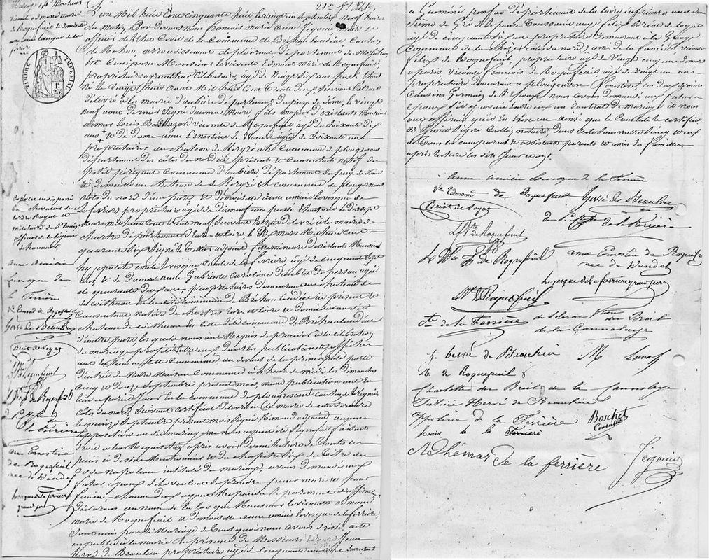 L' an mil huit cent cinquante huit, le vingt un septembre, neuf heures d u matin, par devant nous François Marie Anne JEGOUIN, Maire et offic ier de l'Ètat Civil de la commune de Bréhan Loudéac, canton de Rohan , arrondissement dePloërmel, département du Morbihan, est comparu Mo nsieur le Vicomte Edmond Marie de ROQUEFEUIL, propriétaire agriculte ur, célibataire, âgé de vingt six ans passé, étant né le vingt huit a oût mil huit cent trente deux, suivant extraitdélivré à la mairie d 'Aubière, département du Puy de Dôme, le vingt neuf août dernier, sig né DAUMAS, Maire, fils mineur d'existants Monsieur Aimar Louis Baltha zar, Vicomte de ROQUEFEUIL, âgé de soixante dix ans, colonel en disponibilité, chevalier de l'ordre royal et militaire de Saint Louis, of ficier de la Légion d'Honneur, et de dame Anne Ernestine de WENDEL, âgée de soixante ans, propriétaires au château de Kergré, à la commun e de Plougrescant, département des Côtes du Nord, ici présents et con sentants, natif du Petit Pérignat, commune d'Aubière, département du Puy de Dôme, et demeurant au château de Kergré, en commune de Plougr escant, Côtes du Nord, d'une part ; Et demoiselle Anne Amicie LÈVESQ UE de La FERRIÉRE, propriétaire, âgée de dix neuf ans passé, étant né e le dix sept mars mil huit cent trente neuf, suivant extrait délivré à la mairie de Chartre, département d'Eure et Loire, le dix mars mi l huit cent quarante six,signé Le TELLIER, adjoint fille mineure d'e xistants Monsieur Hyppolite Èmile LÈVESQUE, Comte de La FERRIÉRE, âgé de cinquante sept ans, et de dame Anne Gabrielle Caroline DOUBLET d e PERSAN, âgée de quarante deux ans, propriétairesdemeurant au châte au de Coëthuan, en ladite commune de Bréhan Loudéac, ici présents et consentants, native de Chartres, Eure et Loire, et domiciliée audit château de Coëthuan, en cette dite commune de Bréhan Loudéac, d'autre part ;Lesquels nous ont requis de procéder à la célébration du mar iage projeté entre eux, dont les publications et affiches ont eu lieu en cette commune au devant de la principale porte d'entrée de notre maison commune à l'heure de midi lesdimanches cinq et douze septemb re présent mois, mêmes publications ont eu lieu à pareils jours en la commune de Plougrescant, canton de Tréguier, Côtes du Nord, suivant certificat délivré en la Mairie de cette dernière le quinze septembre présent mois, signé RÈMOND, adjoint ; Aucune opposition au dit mar iage ne nous ayant été signifiée, faisant droit à leur réquisition, a près avoir donné lecture de toutes les pièces ci-dessus mentionnées e t du chapitre six du titre duCode Napoléon intitulé du mariage, avon s demandé aux futurs époux s'ils veulent se prendre pour mari et pou r femme, chacun d'eux ayant répondu séparément et affirmativement, dé clarons au nom de la loi que Monsieur le Vicomte Edmond Mariede ROQ UEFEUIL et demoiselle Anne Amicie LÈVESQUE de La FERRIÉRE sont unis p ar le mariage, de tout quoi nous avons dressé acte en public à la ma irie, en présence de Messieurs Èdouard Jean HERVÈ de BEAULIEU, propri étaire, âgé de cinquanteun ans, demeurant à Guéméné Penfao, départe ment de la Loire Inférieure, oncle au deuxième degré de l'épouse, Tou ssaint Ange Félix BRIOT de LOYAT, âgé de cinquante six ans, propriét aire demeurant à la Grange, commune de la Chèze (Côtes duNord), ami de la famille, Vicomte Félix de ROQUEFEUIL, propriétaire, âgé de ving t cinq ans, demeurant à Paris, Vicomte François de ROQUEFEUIL, âgé d e vingt un ans, propriétaire, demeurant à Plougonven, Finistère, ces deux derniers cousins germains de l'époux ; nous avons demandé aux f uturs époux s'il y avait entre eux un contrat de mariage, ils nous on t affirmé qu'il en existe un, ainsi que le constate le certificat ci- joint signé COLLIN, notaire, dont acte sousnotre seing, et ont tous les comparans et assistants, parents et amis des familles après lect ure lesdits jour et an,