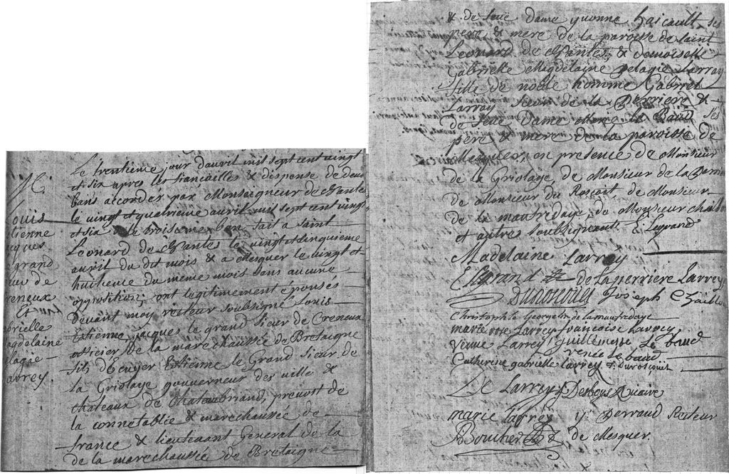 Le trentième jour d'avril mil sept cent vingt et six, après les fiançailles et dispense de deux bans accordés par Monseigneur de Nantes le vingt et quatrième avril mil sept cent vingt et six, le troisième bans fait à Saint Léonard de Nantes le vingt et cinquième avril du dit mois et à Mesquer le vingt et huitième du même mois sans aucune opposition ; ont légitimement épousés devant moy, Recteur soussigné, Louis Estienne Jacques Le GRAND, Sieur de Creneux, Officier de la Maréchausséede Bretaigne, fils d'Écuyer Estienne Le GRAND, Sieur de la Griolaye, Gouverneur des ville et château de Châteaubriand, Prévost de la Connétablée et Maréchaussée de France et Lieutenant Général de la Maréchaussée de Bretaigne, et de feue Dame Yvonne HAICAULT, ses père et mère, de la paroisse de Saint Léonard de Nantes, & Demoiselle Gabrielle Magdelaine Pélagie LARRAY, fille de Noble Homme Gabriel LARRAY, Sieur de La PERRIÈRE, et de feue Dame Marie Le BAUD, ses père et mère, de la paroisse de Mesquer, en présence de Monsieur de La GROILAYE, de Monsieur de La PERRIÈRE, de Monsieur de RASCOUËT, de Monsieur de La MAUFREDAYE, de Monsieur CHAILLOUX, et autres soussignants,