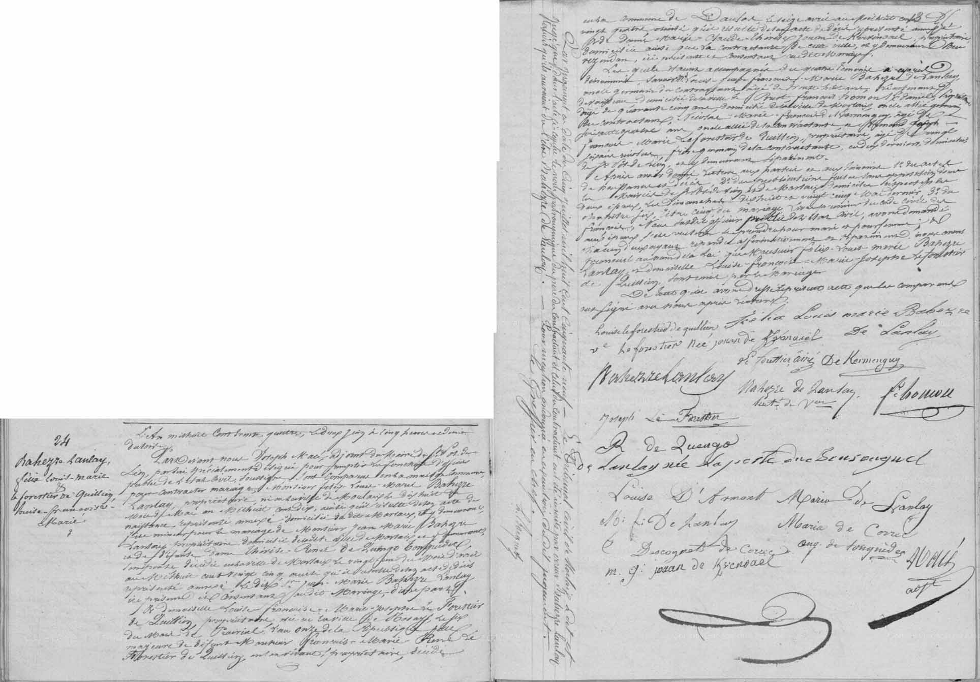 [signé :] Louise Le Forestier de Quilien, Félix Louis Marie Bahèzre de Lanlay, Ve Le Forestier née Jouan de Kernenoaël, Le Forestier aîné, de Kermenguy, Bahèzre de Lanlay, Bahèzre de Lanlay Lieut[enan]t de v[aisse]au, Fr. Homon, Joseph Le Forestier, R. de Quengo, de Lanlay née La Porte du Bourouguel, Louise d'Armont, Marie de Lanlay, M. F. de Lanlay, Maria de Correc, C. des Cognets de Correc, Ang. de Tonquédec, M. G. Jouan de Kerenoaël, Macé adjoint.