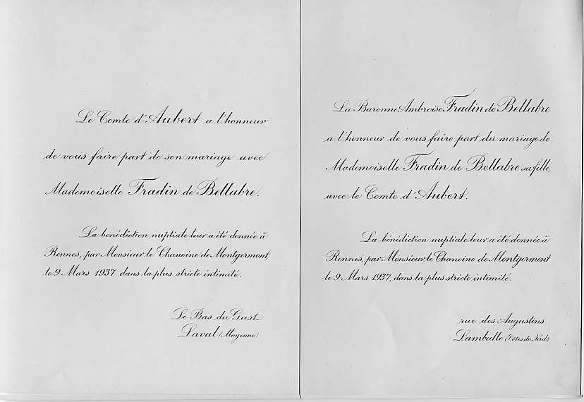 Faire-part du mariage entre Louis Joseph Marie d'Aubert et Marie Fradin de Bellabre - Rennes (35) - 9 mars 1937.