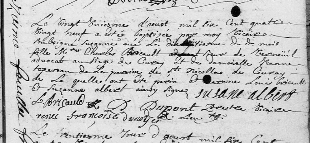 Acte de baptême de Suzanne Bricauld. - Civray (86), Saint-Nicolas, 21 août 1689.