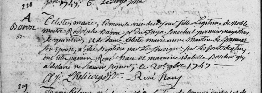 Acte de baptême de Céleste Marie Edmonde Baron du Taya. - Quintin (22), 20 novembre 1747.