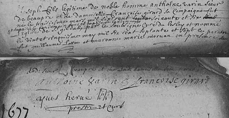 Acte de baptême de Joseph Varin, Le Leslay (22), 25 mai 1677.