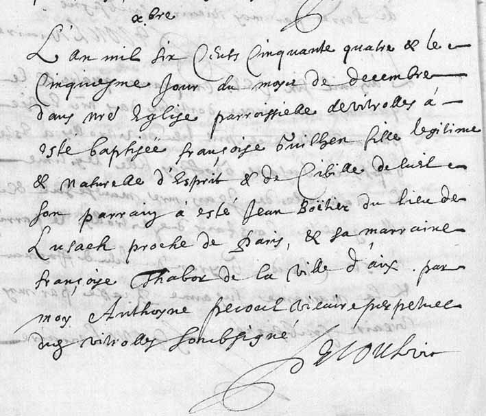 Acte de baptême de Françoise Guilhen, Vitrolles (13), 5 décembre 1654.