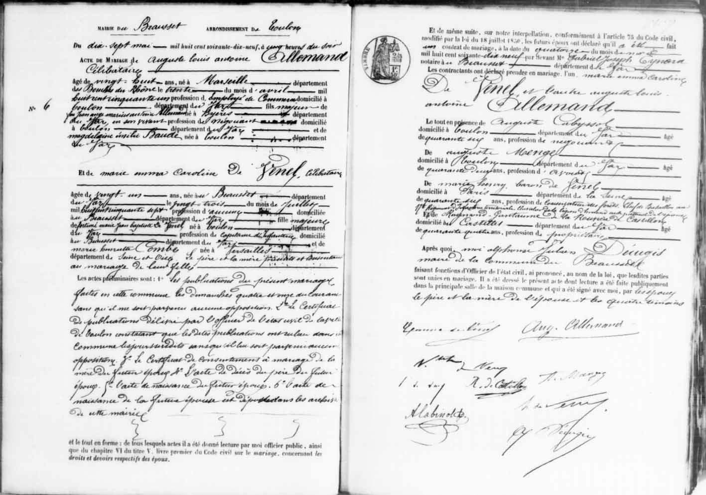 Mairie du Beausset, Arrondissement de Toulon. Du dix-sept mai mil huit cent soixante-dix-neuf, à cinq heures du soir, Acte de Mariage de Auguste Louis Antoine Allemand, célibataire, âgé de vingt-huit ans, né à Marseille, département des Bouches du Rhône, le trente du mois d'avril mil huit cent cinquante un, profession d'employé de commerce, domicilié à Toulon, département du Var, fils majeur de feu Jean Ange Marius Antoine Allemand, né à Hyères, département du Var, en son vivant profession de négociant, domicilié à Toulon, département du Var, et de Magdeleine Émilie Baude, née à Toulon, département du Var, Et de Marie Emma Caroline de Venel, célibataire, âgée de vingt-un ans, née au Beausset, département du Var, le vingt-trois du mois de juillet mil huit cent cinquante sept, profession d'aucune, domiciliée au Beausset, département du Var, fille majeure de Fortuné Marie Jean Baptiste de Venel, né à Toulon, département du Var, profession de Capitaine d'Infanterie, domicilié au Beausset, département du Var, et de Marie Henriette Combe, née à Versailles, département de Seine-et-Oise. Le père et la mère présents et consentant au mariage de leur fille. Les actes préliminaires sont : 1° Les publications du présent mariage faites en cette commune les dimanches quatre et onze du courant sans qu'il ne soit parvenu aucune opposition. 2° Le certificat de publications délivré par l'officier de l'état civil de la ville de Toulon constatant que les dites publications ont eu lieu dans sa commune les jours susdits sans qu'il lui soit parvenu aucune opposition. 3° Le certificat de consentement à mariage de la mère du futur époux. 4° L'acte de décès du père du futur époux. 5° L'acte de naissance du futur époux. 6° L'acte de naissance de la future épouse est déposé dans les archives de cette mairie, et le tout en forme : de tous lesquels actes il a été donné lecture par moi officier public, ainsi que du chapitre VI du titre V livre premier du Code civil sur le mariage, concernant les droits et devoirs respectifs des époux. Et de même suite, sur notre interpellation, conformément à l'article 75 du Code civil, modifié par la loi du 18 juillet 1850, les futurs époux ont déclaré qu'il a été fait un contrat de mariage, à la date du quatorze du mois de mai mil huit cent soixante-dix-neuf par devant Me Gabriel Joseph Cymard, notaire au Beausset, département du Var. Les contractants ont déclaré prendre en mariage, l'un Marie Emma Caroline de Venel, et l'autre Auguste Louis Antoine Allemand. Le tout en présence de Auguste Cabyssol, domicilié à Toulon, département du Var, âgé de quarante six ans, profession de négociant ; De Auguste Mange, domcilié à Toulon, département du Var, âgé de quarante deux ans, profession d'Avocat ; De Marie Henry, baron de Venel, domicilié à Paris, département de la Seine, âgé de quarante six ans, profession de Conservateur des forêts, Chef de Bataillon au 17e Régiment d'Infanterie territoriale, Chevalier de la légion d'honneur, oncle paternel de l'épouse ; Et de Raymond Gantaume de La Rouvière de Castillon, domicilié au Castellet, département du Var, âgé de quarante quatre ans, profession de propriétaire. Après quoi, moi Alphonse Julien Décugis, maire de la Commune du Beausset, faisant fonction d'Officier de l'état civil, ai prononcé, au nom de la loi, que lesdites parties sont unies en mariage. Il a été dressé le présent acte dont lecture a été faite publiquement dans la principale salle de la maison commune et qui a été signé avec moi, par les époux, le père et la mère de l'épouse et les quatre témoins.