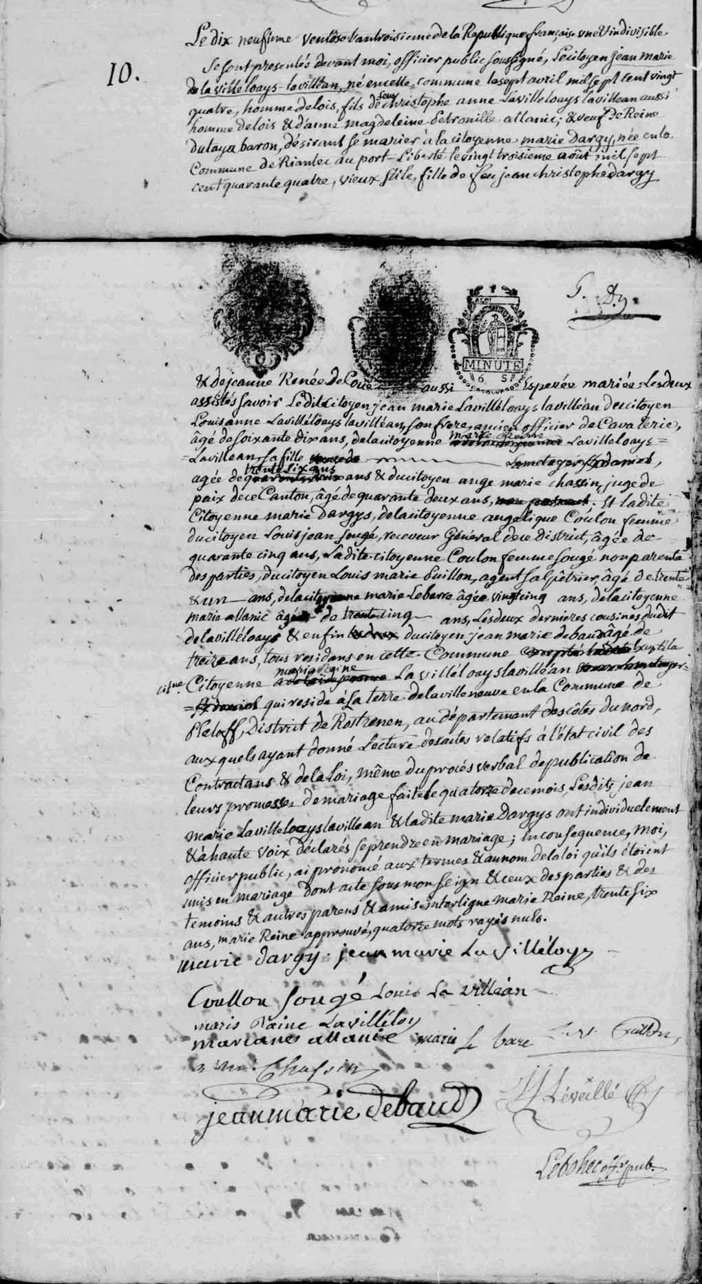 Le dix neufvième ventôse l'an troisième de la République française une et indivisible, se sont présentés devant moi, officier public soussigné, le citoyen Jean Marie [rayé : de] Lavilleloays-Lavilléan, né en cette commune le sept avril mil sept cent vingt quatre, homme de lois, fils de feus Christophe Anne Lavilleloays Lavilléan aussi homme de lois, & d'Anne Magdeleine Pétronille Allanic ; & veuf de Reine Dutaya Baron, désirant se marier à la citoyenne Marie Dargy, née en la commune de Riantec au Port-Liberté, le vingt troisième août mil sept cent quarante quatre, vieux stile, fille de feu Jean Christophe Dargy & de Jeanne Renée de Couer, aussi espérée mariée. Les deux assistés savoir ledit citoyen Jean Marie Lavilleloays Lavilléan du citoyen Louis Anne Lavilleloays Lavilléan, son frère, ancien officier de Cavalerie, âgé de soixante dix ans, de la citoyenne Marie Reine Lavilleloays Lavilléan, sa fille [un blanc et des ratures] âgée de trente six ans, & du citoyen Ange Marie Chassin, juge de paix de ce Canton, âgé de quarante deux ans,[rayé : non parent] ; Et ladite citoyenne Marie Dargy, de la citoyenne Angélique Coulon, femme du citoyen Louis Jean Sougé, receveur général de ce district, âgée de quarante cinq ans, la dite citoyenne Coulon femme Sougé non parente des parties, du citoyen Louis Marie Puillon, agent salpétrier, âgé de trente & un ans, de la citoyenne Marie Lebarre, âgée [de] vingt cinq ans, de la citoyenne Marie Allanic, âgée de trente cinq ans, les deux dernières cousines dudit de Lavilleloays, & enfin du citoyen Jean Marie de Baud, âgé de treize ans, tous résidans en cette Commune, excepté la citoyenne Marie Reine Lavilleloays Lavilléan qui réside à la terre de la Villeneuve en la commune de Pléloff, district de Rostrenen, au département des Côtes du Nord, auxquels ayant donné lecture des actes relatifs à l'état civil des Contractans & de la loi, même du procès verbal de publication de leurs promesses de mariage faite le quatorze de ce mois, lesdits Jean Marie Lavilleloays Lavilléan & ladite Marie Dargys ont individuelement & à haute voix déclarés se prendre en mariage ; en conséquence, moi, Officier public, ai prononcé aux termes & au nom de la loi qu'ils étoient unis en mariage dont acte sous mon seign & ceux des parties & des témoins & autres parens & amis.