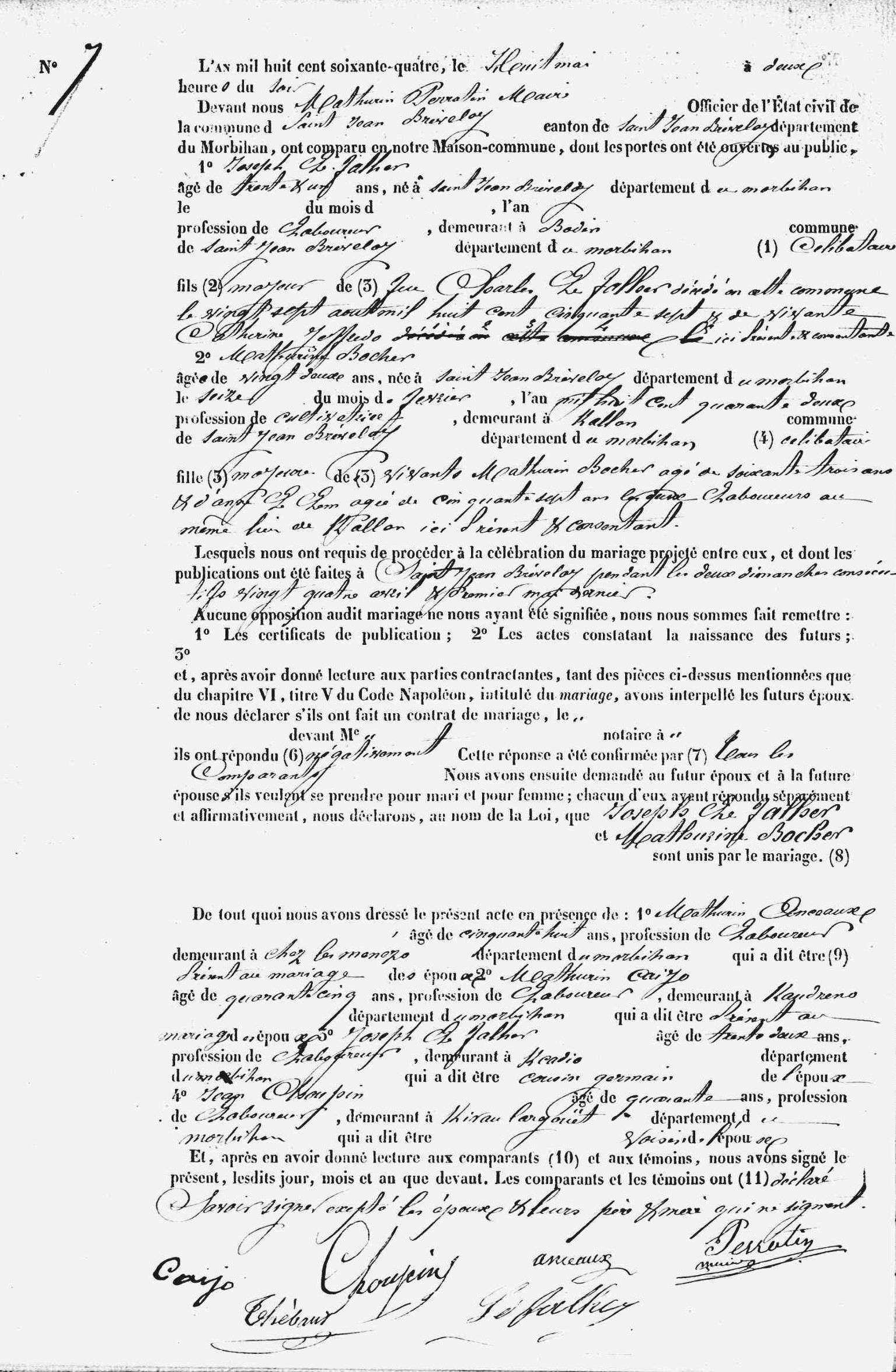L'an mil huit cent soixante-quatre, le Huit mai à deux heures du soir Devant nous Mathurin Perrotin Maire Officier de l'État civil de la commune de Saint Jean Brévelay canton de Saint Jean Brévelay département du Morbihan, ont comparu en notre Maison-commune, dont les portes ont été ouvertes au public, 1° Joseph Le Falher agé de trente & un ans, né à Saint Jean de Brévelay département du Morbihan le... du mois d... , l'an... profession de laboureur, demeurant à Bodin commune de Saint Jean Brévelay département du Morbihan (1) célibataire fils (2) majeur de (3) feu Charles Le Falher décédé en cette commune le 27 août mil huit cent cinquante sept & de vivante Catherine ...?... [plusieurs mots la déclarant décédée rayés] ici présente et consentante 2° Mathurine Bocher agée de vingt deux ans, née à Saint Jean Brévelay département du Morbihan le seize du mois de février, l'an mil huit cent quarante deux profession cultivatrice, demeurant à Kallon commune de Saint Jean Brévelay département du Morbihan (4) célibataire fille majeure de (3) vivants Mathurin Bocher agé de soixante trois ans & d'Anne Le Lam agée de cinquante sept ans les deux laboureurs au même lieu de Kallon ici présent & consentant. Lesquels nous ont requis de procéder à la célébration du mariage projeté entre eux, et dont les publications ont été faites à Saint Jean Brévelay pendant les deux dimanches consécutifs vingt quatre avril & premier mai dernier. Aucune opposition audit mariage nous ayant été signifiée, nous nous sommes fait remettre : 1° Les certificats de publication ; 2° Les actes constatant la naissance des futurs ; 3° et, après avoir donné lecture aux parties contractantes, tant des pièces ci-dessus mentionnées que du chapitre VI, titre V du Code Napoléon, intitulé du mariage, avons interpellé les futurs époux de nous déclarer s'il ont fait contrat de mariage, le // devant Me // notaire à // ils ont répondu (6) négativement. Cette réponse à été confirmée par (7) tous les comparants. Nous avons ensuite demandé au futur époux et à la future épouse s'ils veulent se prendre pour mari et pour femme ; chacun d'eux ayant répondu séparément et affirmativement, nous déclarons, au nom de la Loi, que Joseph Le Falher et Mathurine Bocher sont unis par le mariage. (8) De quoi nous avons dressé le présent acte en présence de : 1° Mathurin Anceaux, agé de cinquante huit ans, profession de laboureur demeurant à chez les menezo [lieu-dit de Plumelec] département du Morbihan qui a dit être (9) présent au mariage des époux & 2° Mathurin Caijo agé de quarante cinq, profession de laboureur, demeurant à Kaudreno [?] département du Morbihan qui dit être présent au mariage des époux & 3° Joseph Le Falher âgé de trente deux ans, profession de laboureur, demeurant à Kerdio [?] département du Morbihan qui dit être cousin germain de l'époux 4° Jean Choupin âgé de quarante ans, profession de Laboureur, demeurant à Kirau largouët [?] département du Morbihan qui dit être voisin de l'épouse. Et, après en avoir donné lecture aux comparants (10) et aux témoins, nous avons signé le présent, lesdits jours, mois et an que devant. Les comparants et les témoins ont (11) déclaré savoir signé excepté les épouse & leurs père & mère qui ne signent.