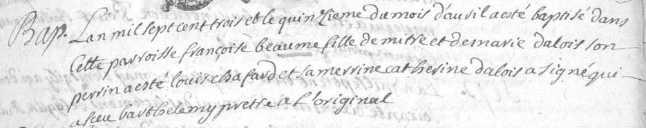 Acte de baptême de Françoise Beaume, Rognes (13), 15 avril 1703.