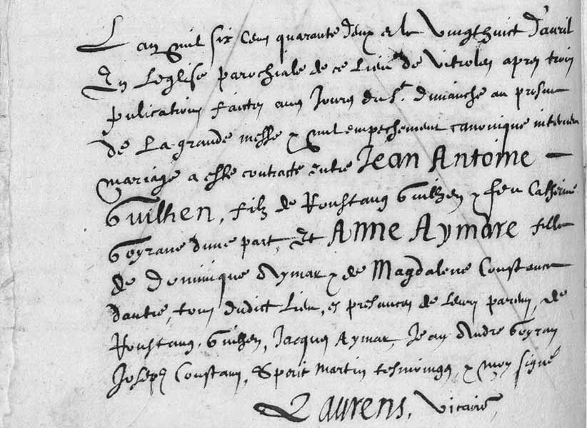 L'an mil six cens quarante deux et le vingt huict d'avril, en l'église parochiale de ce lieu de Vitroles, après trois publications faictes aux jours du St dimanche au prosne de la grande messe, & nul empeschement canonique intervenu, mariage a esté contracté entre Jean Antoine GUILHEN, fils de Roustang GUILHEN, & feu Catherine GOYRANE, d'une part, et Anne AYMARE, fille de Dominique AYMAR & de Magdalène CONSTANCE, d'autre, tous dudict lieu, en présance de leurs parens, de Roustang GUILHEN, Jacques AYMAR, Jean André GOYRAN, Joseph CONSTANT, Spérit MARTIN, tesmoings & moy signé, LAURENS vicaire. |