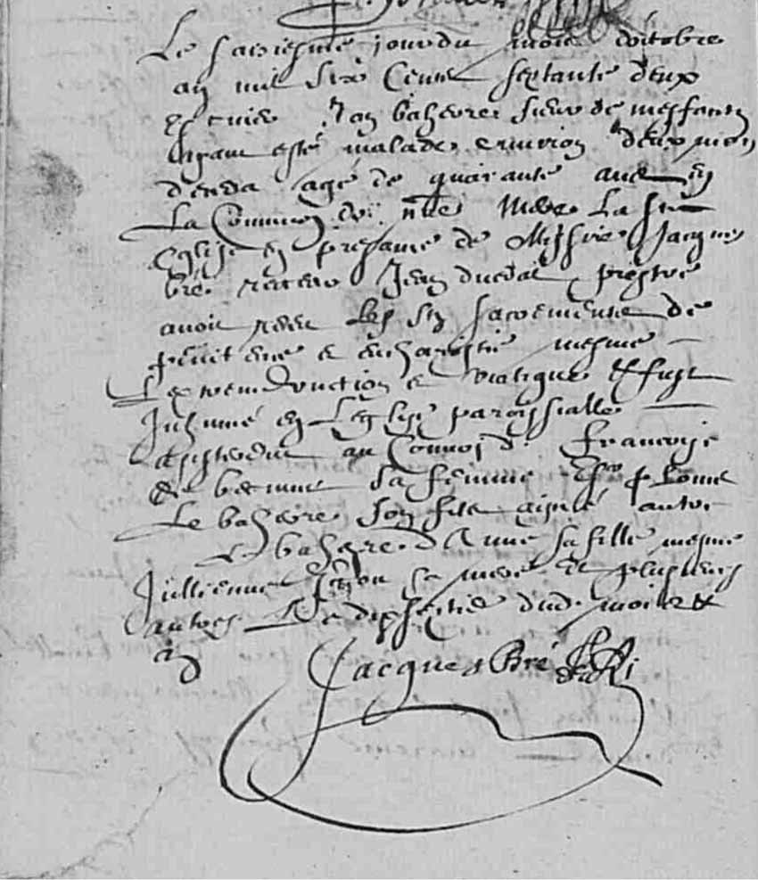 AD-22 - État-civil de Plésidy - BMS de 1669 à 1712 – Image 59 : Inhumation du 16 octobre 1672 : Le saiziesme jour du mois d'octobre an mil six cent septante deux, escuier Jan BAHÈZRE, sieur de Mesfantan, ayant esté malade environ deux mois, décéda âgé de quarante ans en la communion de nostre mère, la Ste Église en présance de Missire Jacques BRÉ, recteur, Jean DUEDAL, prestre, avait reçu les Sts Sacremens de pénitence & eucharistie meesme l'extrême unction & viatique, et fust inhummé en l'église paroissialle. Assistèrent au convoy Françoise de BECMEUR, sa femme, Escuier Louis (?) Le BAHÈZRE, son fils aisné, autre Le BAHÈZRE Anne, sa fille, mesme Jullienne JEGOU, sa mère, de plusieurs autres, le dix septiesme dudit mois. Jacques BRÉ ptre.
