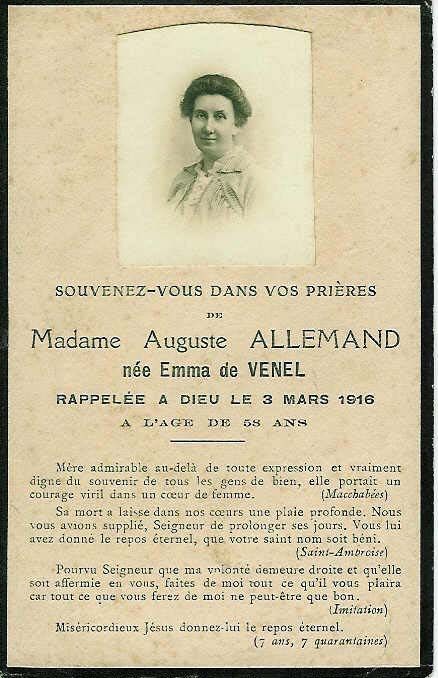 | Image mortuaire de Marie "Emma" Caroline de Venel - 3 mars 1916. | 1 | 0 | 0 | June 15, 2019 - 3:59:55 p.m. |