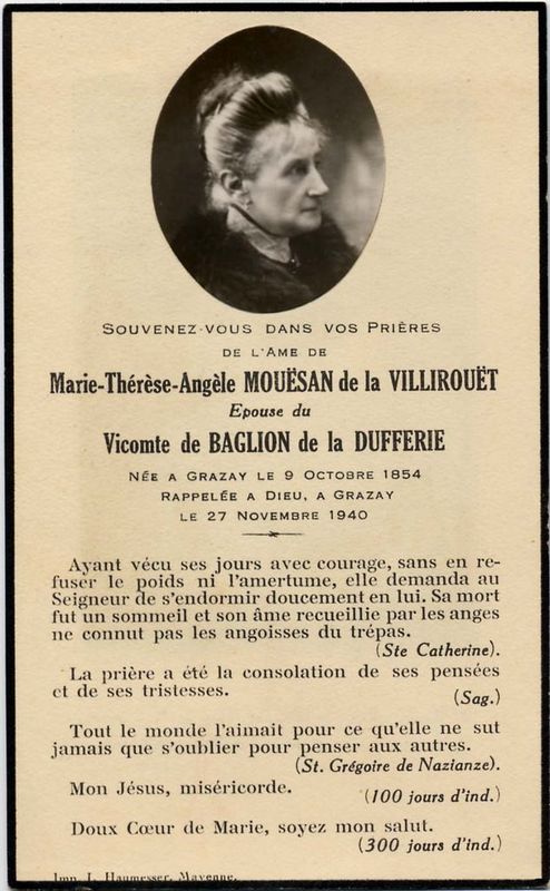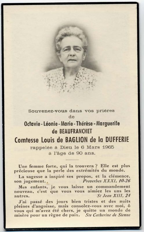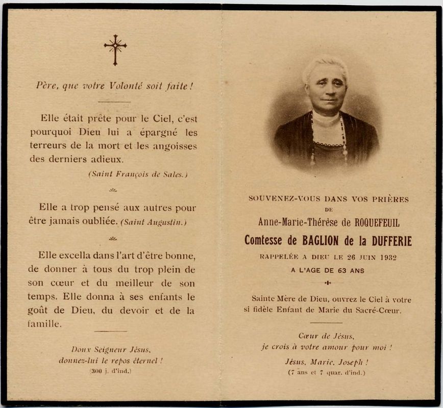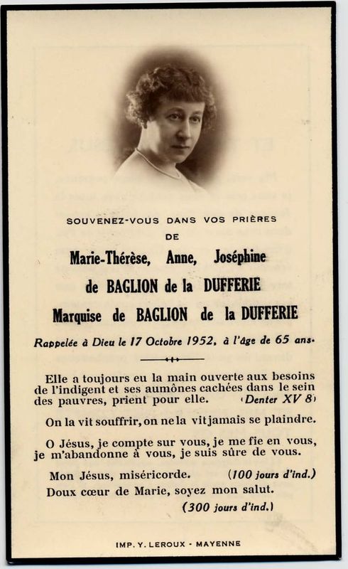 | Image mortuaire de Marie Thérèse Anne Joséphine de Baglion de La Dufferie - 17 octobre 1952. | 1 | 0 | 0 | June 15, 2019 - 4:04:59 p.m. |