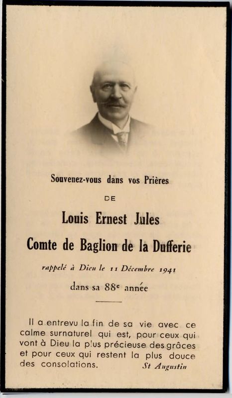 | Image mortuaire de Louis Ernest "Jules" de Baglion de La Dufferie - Château de la Motte, à Martigné (53) - 11 décembre 1941. | 1 | 0 | 0 | April 7, 2021 - 10:39:49 a.m. |