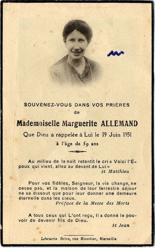 | Image mortuaire de Marguerite Marie Jeanne Allemand - 19 juin 1951. | 1 | 0 | 0 | June 15, 2019 - 3:59:25 p.m. |