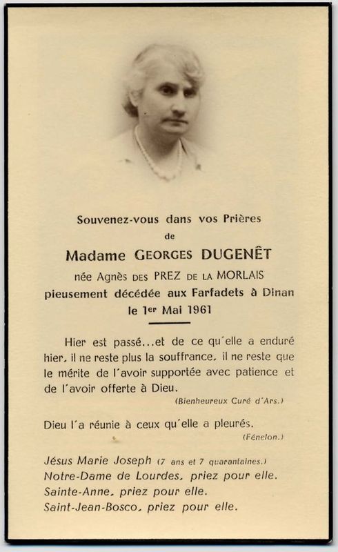 | Image mortuaire d'Agnès des Prez de La Morlais - 1er mai 1961. | 1 | 0 | 0 | June 15, 2019 - 10:45:16 a.m. |
