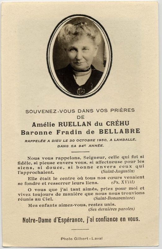 | Image mortuaire de Amélie Augustine Hippolyte Maarie Renée Ruellan du Créhu - Lamballe (22) - 30 octobre 1950. | 1 | 0 | 0 | June 15, 2019 - 10:55:37 a.m. |