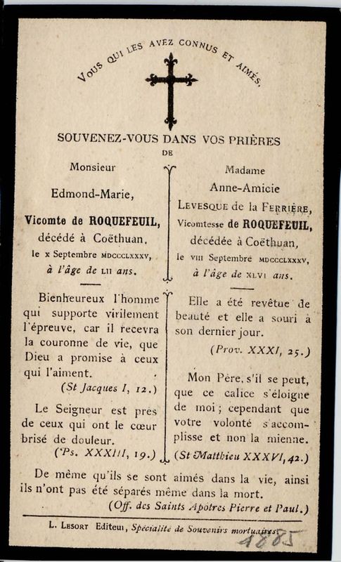 | Image mortuaire d'Edmond-Marie de Roquefeul-Cahuzac et de Anne-Amicie Lévesque de La Ferrière - château de Coëthuan, à Bréhan-Loudéac (56) - 8 et 10 septembre 1885. | 1 | 0 | 0 | June 15, 2019 - 10:53:45 a.m. |