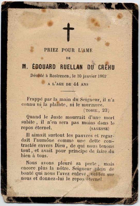 | Image mortuaire d'Édouard Jean Marie Ruellan du Créhu - Rostrenen (22) - 10 janvier 1862. | 1 | 0 | 0 | June 15, 2019 - 10:53:58 a.m. |