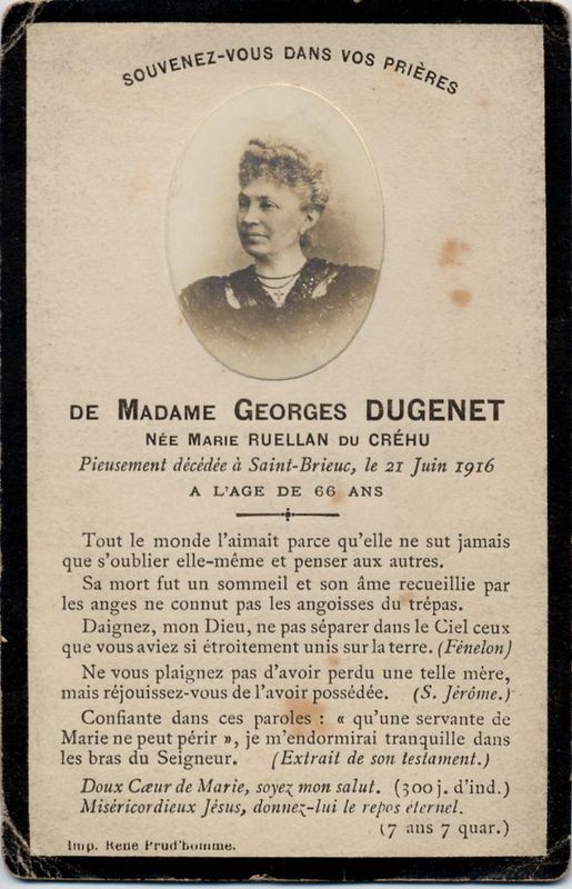 | Image mortuaire de Marie Ruellan du Créhu - Saint-Brieuc (22) - 21 juin 1916. | 1 | 0 | 0 | June 15, 2019 - 4:04:43 p.m. |