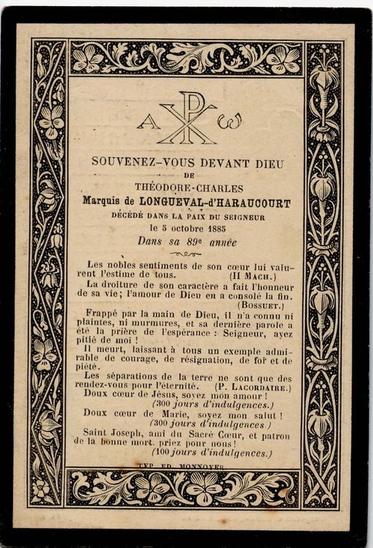 | Image mortuaire de Théodore Charles de Longueval d'Haraucourt - 5 octobre 1885. | 1 | 0 | 0 | June 15, 2019 - 4:09:45 p.m. |