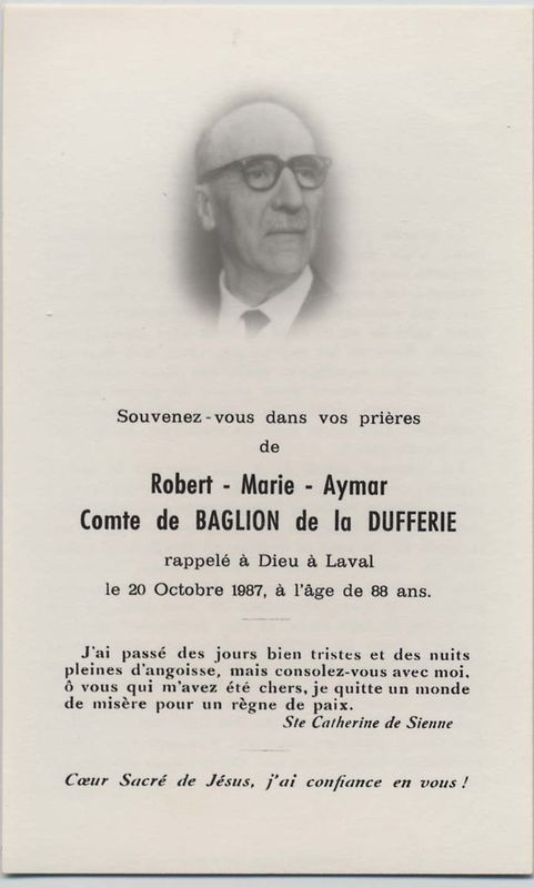| Image mortuaire de Robert Marie Aymar de Baglion de La Dufferie - Laval (53) - 20 octobre 1987. | 1 | 0 | 0 | June 15, 2019 - 4:09:07 p.m. |