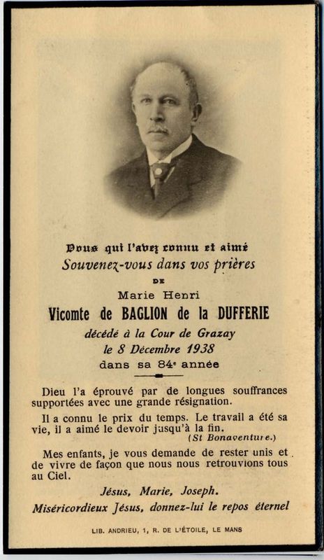 | Image mortuaire de Henry de Baglion de La Dufferie - château de la Cour, à Grazay (53) - 8 décembre 1938. | 1 | 0 | 0 | June 15, 2019 - 3:50:16 p.m. |