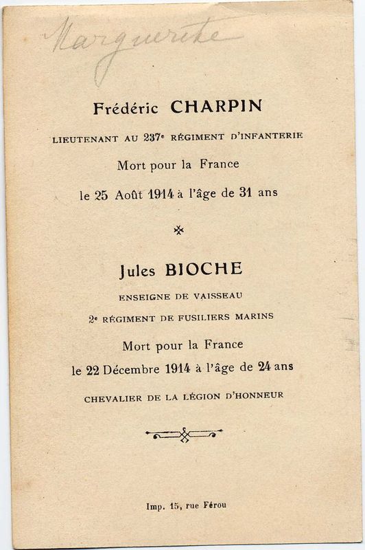 | Image mortuaire de Frédéric Charpin - 25 août 1914 - et Jules Bioche - 22 décembre 1914 - Morts pour la France. | 2 | 0 | 0 | June 15, 2019 - 11:02:13 a.m. |