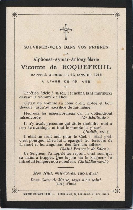 | Image mortuaire de Alphonse Aymar Antony Marie de Roquefeuil-Montpeyroux - 13 janvier 1912. | 1 | 0 | 0 | June 15, 2019 - 10:55:08 a.m. |