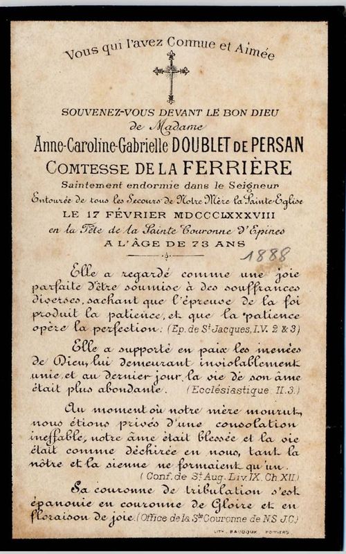 | Image mortuaire d'Anne Caroline Gabrielle Doublet de Persan - 17 février 1888. | 1 | 0 | 0 | June 15, 2019 - 10:47:27 a.m. |