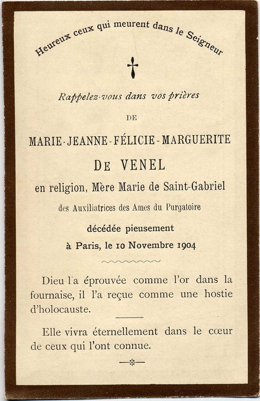 | Image mortuaire de Marie Jeanne Félicie "Marguerite" de Venel - Paris (75) - 10 novembre 1904. | 1 | 0 | 0 | June 15, 2019 - 4:03:09 p.m. |