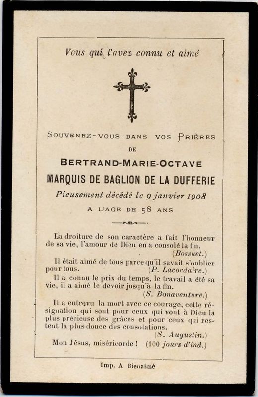 | Image mortuaire de Bertrand de Baglion de La Dufferie - 9 janvier 1908. | 1 | 0 | 0 | June 15, 2019 - 10:59:33 a.m. |