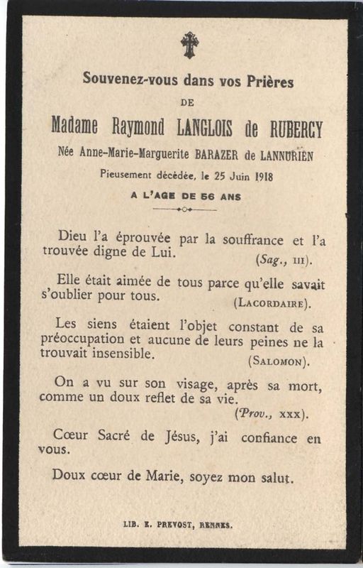 | Image mortuaire d'Anne Marie Marguerite de Barazer de Lannurien - 25 juin 1918. | 1 | 0 | 0 | June 15, 2019 - 10:47:40 a.m. |